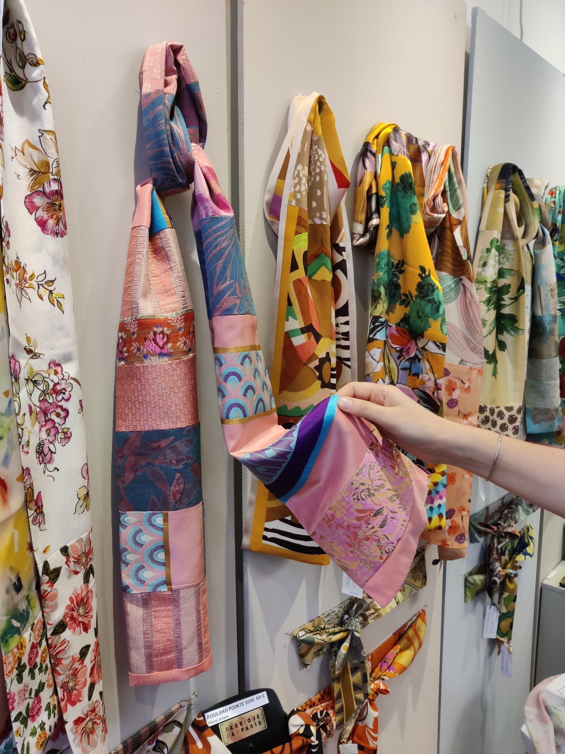 Chacune de ses créations est une pièce unique. Les matières sont issues d’échantillons de collections de tissus couture, dans une démarche éthique et d’upcycling.